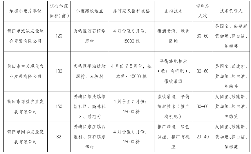 根据上级文件精神,计划建立一批连片20亩以上的大豆增产增效核心示范片和一定规模的辐射示范片。各经营主体申报,网上公示,局务会议研究,确定埭头镇莆田市绿益农业发展有限公司,平海镇莆田市中天现代农业发展有限公司,笏石镇莆田市浓浓农业综合开发有限公司,笏石镇、东庄镇莆田市闽华农业发展有限公司作为承担示范任务实施主体。各承担单位按要求进行示范区建设及技术管理工作。核心示范总种植面积共计432亩。经专家组测查,农药残留量低于国家标准。区农业技术推广站要提供技术方案,宣传指导实现大豆增产的各项技术指导及推广。承担示范任务的种植主体开展玉米大豆带状复合种植技术试验探索,试验面积不低于1亩。