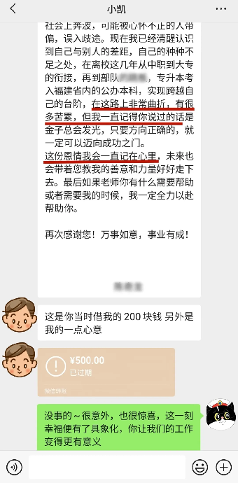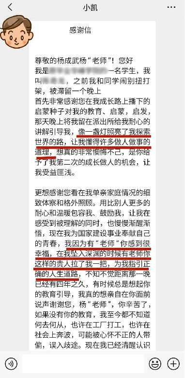 2025年7月4日,小凯输入了那个三年来不曾忘记的电话号码,发出了好友验证,他声声地叫着“杨老师”,发出了那封情真意切的感谢信,并想要返还当时杨成武帮忙垫付的钱。杨成武起初并不记得他是谁,正如他自己所说“教育的孩子实在太多了”,收到感谢信后,杨成武盯着手机看了很久,惊喜、欣慰、幸福,百感交集...他惊喜,自己的一个平凡举动竟然真的影响了小凯的一生;他欣慰,小凯真的做到了“逆袭”;他幸福,他不辜负这身警服的使命。