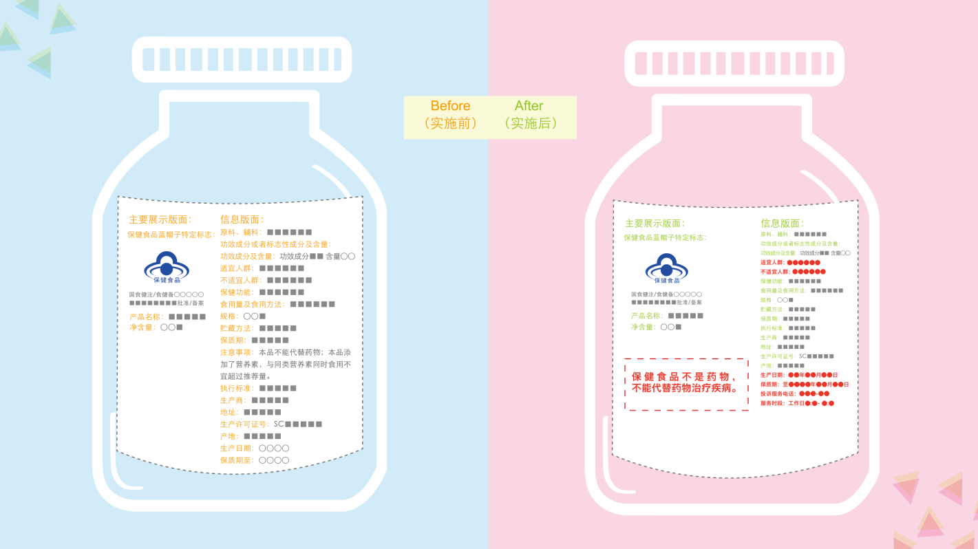 保健食品标签设置警示用语区及警示用语。警示用语区位于最小销售包装包装物(容器)的主要展示版面,所占面积不应小于其所在面的20%。警示用语区内文字与警示用语区背景有明显色差。警示用语使用黑体字印刷,包括以下内容: