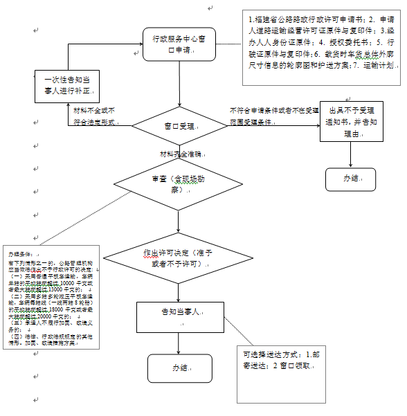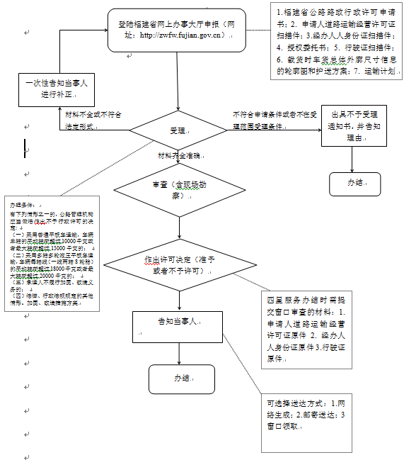 说明:1.申请材料均应加盖单位公章,材料多页的应加盖骑缝章。 2.申请材料可直接邮寄至行政服务中心受理窗口,办理结果也可邮寄送达,快递双向全部免费。 3.委托他人办理的,应提供授权委托书或单位介绍信。 4.该事项办理职权划分范围: (1)莆田市公路事业发展中心直属分中心负责办理城厢、荔城行政辖区内国省干线和替代绕行路线的行政许可; (2)其他县(区)公路分中心负责办理本行政辖区内国省干线和替代绕行路线的行政许可(北岸管委会权限由莆田市公路事业发展中心秀屿分中心实施); (3)各县(区、管委会)交通运输局负责办理农村公路的行政许可。 5.该事项支持一地办证,全线通行。申请人可先在线申报,即打开“福建省网上办事大厅平台”,搜索到对应的事项,然后点击“在线办理”或者在办事指南页面点击“我要申报”,将自动跳转至第三方网站“福建省大件运输并联许可系统”。申请人可在该系统注册账号、企业信息,申请大件运输。