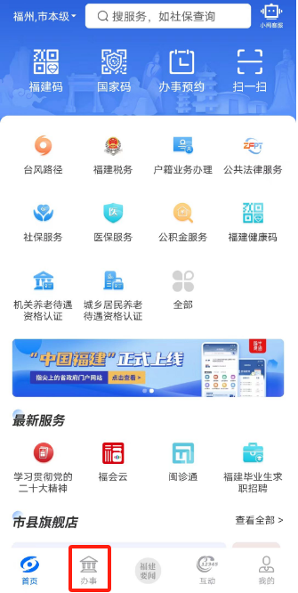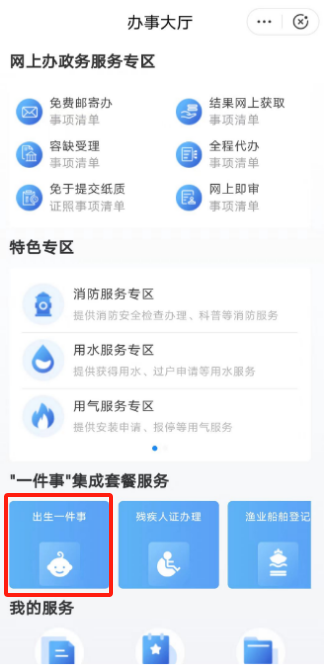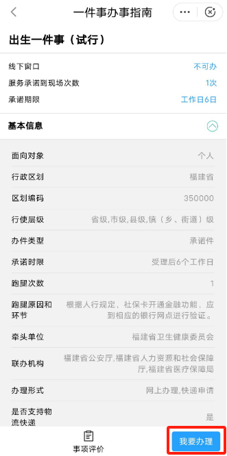 打开“闽政通”-底部“办事”-“一件事”集成套餐服务的“出生一件事”-点击“我要办理”。