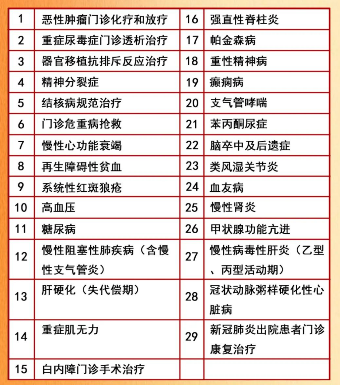 根据《福建省人民政府办公厅关于完善职工基本医疗保险门诊共济保障机制的实施意见》,统一职工医保门诊特殊病种种类,在原有基础上调整设定29个门诊慢特病种: