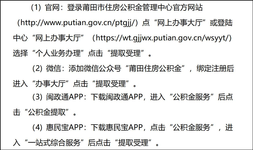 福建省住房公积金网上办事大厅(https://cx.fjszgjj.com/wsyyt/yyt.html?t=1717138980146);莆田市住房公积金管理中心微信公众号、闽政通及惠民宝APP
