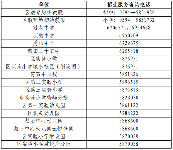 6.市实验小学秀屿分校:招收户籍在笏石镇岐厝村、刘厝村以及五马山小区、云悦一号小区、国投景园小区、状元邸小区、兰亭雅居小区、国投迎宾府小区购房户的适龄儿童。