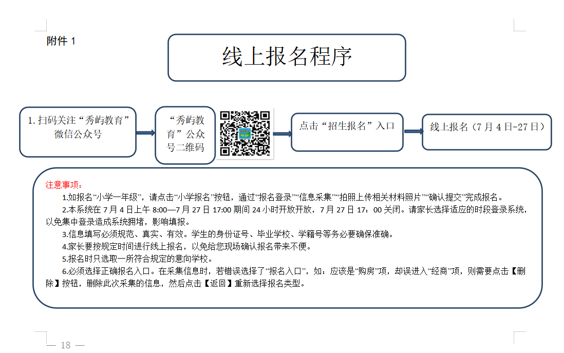 3.报名时间:7月4日至7月27日,具体报名方式见附件。申请就读对象在规定时间内网上报名,提供以上相关材料按时送规定的地点审核认定,未在规定时间内提供相关材料送相应学校审核认定的,取消其派位(摇号)资格。提供虚假材料者即使派位成功,经查实后,取消入学资格。