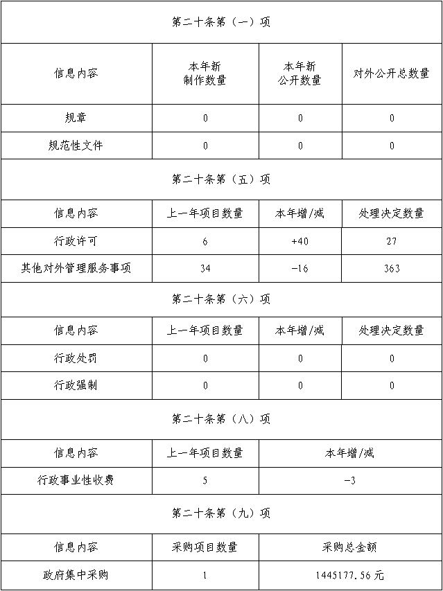 2020年,我局紧紧围绕加强政策解读和回应关切、推进决策和执行公开、深化重点领域信息公开、政府信息公开平台建设、监督保障和标准化规范化有序推进。结合实际制定工作计划,安排具体工作,确定公开任务,明晰工作职责。不仅抓牢面上工作,又突出重点,促进了各项工作协同推进。在主动公开的政府信息中,我局将政府信息分为信息公开指南、信息公开目录、信息公开年度报告、依申请公开、信息公开制度规定、信息公开意见箱等6类。其中:信息公开目录分为工作信息和其他应当公布的其他政府信息,截止目前,工作信息371条,其他应当公布的其他政府信息25条。2020年,我局共主动公开政府信息37条,全文电子化达100%。