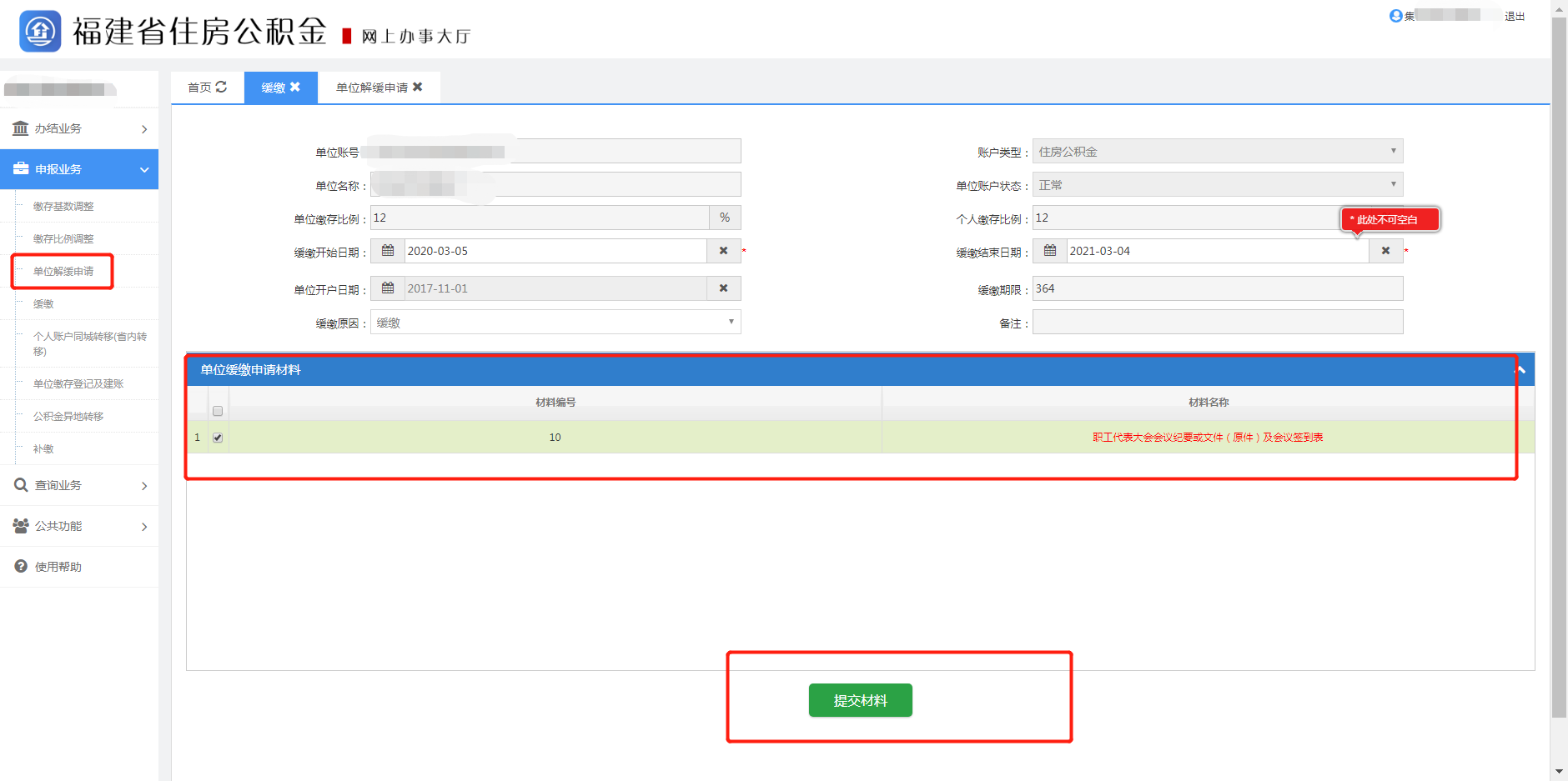 1单位经办人可通过点击横向菜单中“申报业务”后显示的左侧菜单中的“单位缓缴申请”进入页面如下图:
