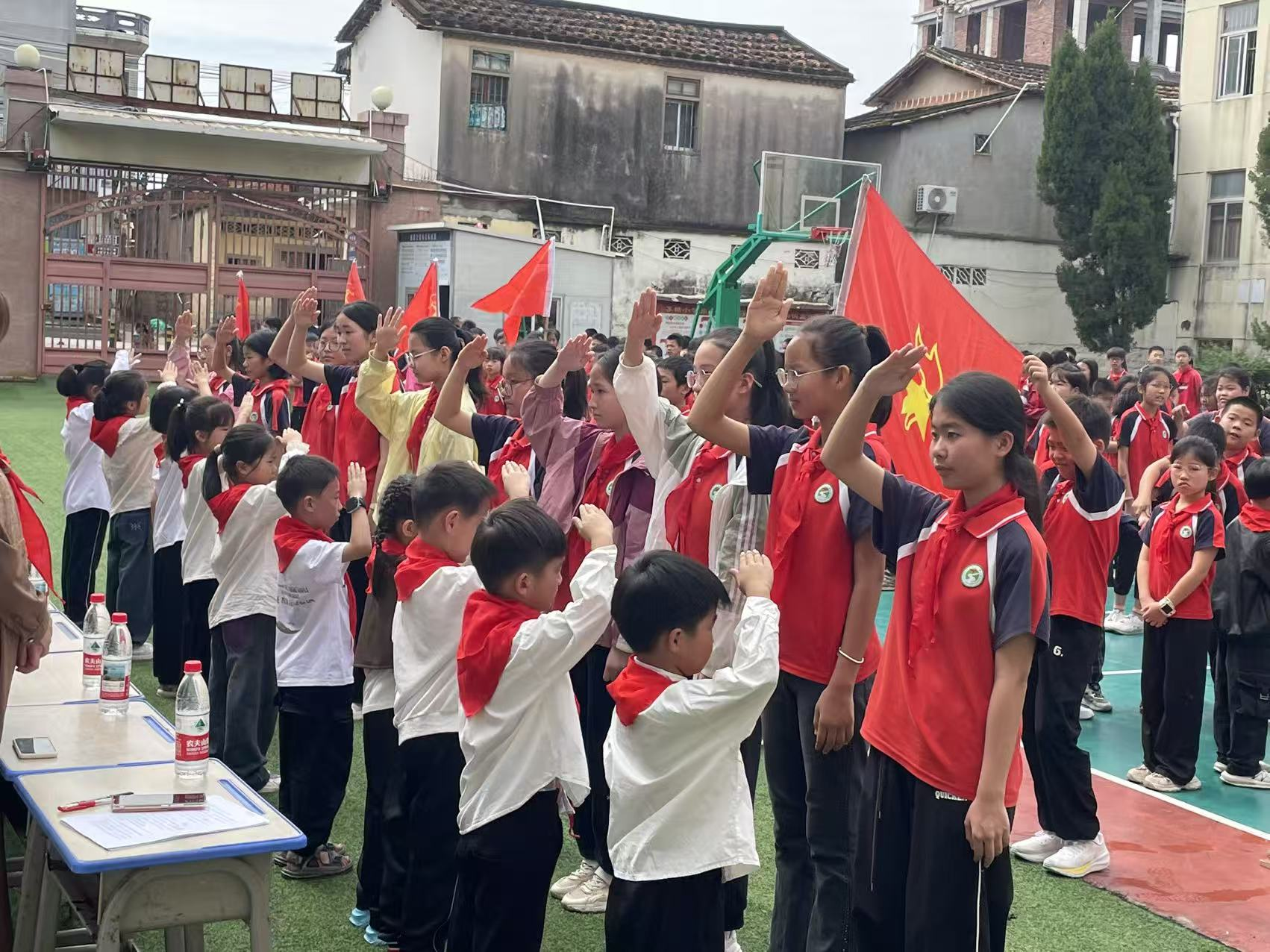 10月13日上午,东峤中心小学以“红领巾心向党 争做新时代好队员”为主题,隆重举行中国少年先锋队建队纪念日活动,传承少先队光荣传统。活动在庄严的升旗仪式中开启,少先队员们肃立敬礼,神情庄重,用行动传递对祖国的热爱与崇敬。新队员们满怀激动与自豪,郑重地将鲜艳的红领巾系在胸前,灿烂的笑容在脸上绽放,眼中满是对少先队身份的珍视。(周忠泮)