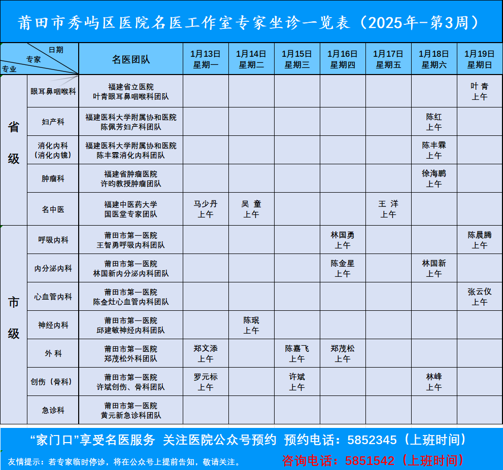 秀屿区医院2025年1月13日-1月19日省、市专家坐诊一览表