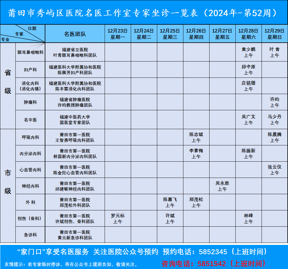 秀屿区医院2024年12月23日-12月29日省、市专家坐诊一览表