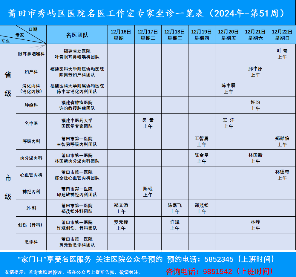 秀屿区医院2024年12月16日-12月22日省、市专家坐诊一览表