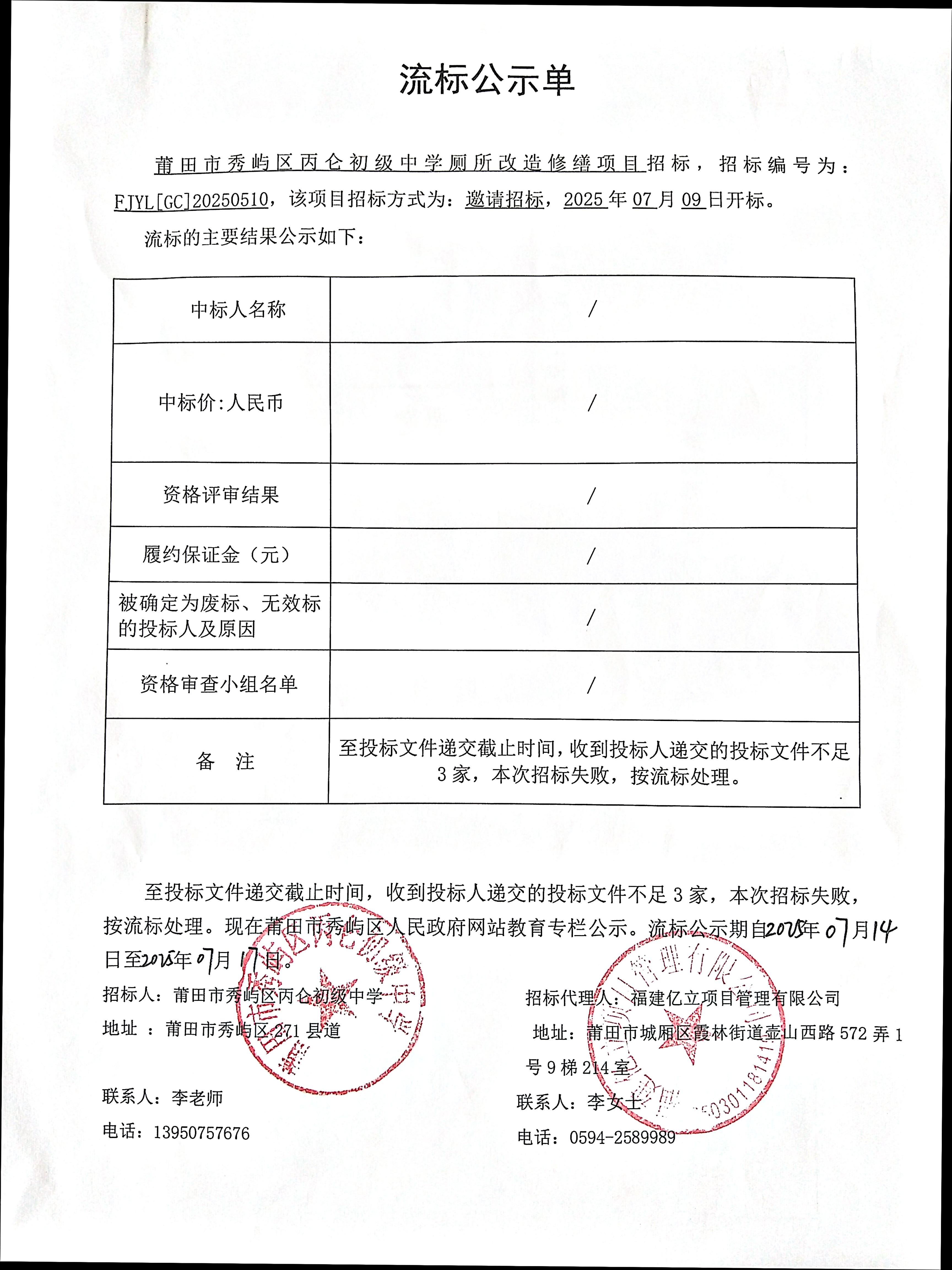 莆田市秀屿区丙仑初级中学厕所改造修缮项目流标公示
