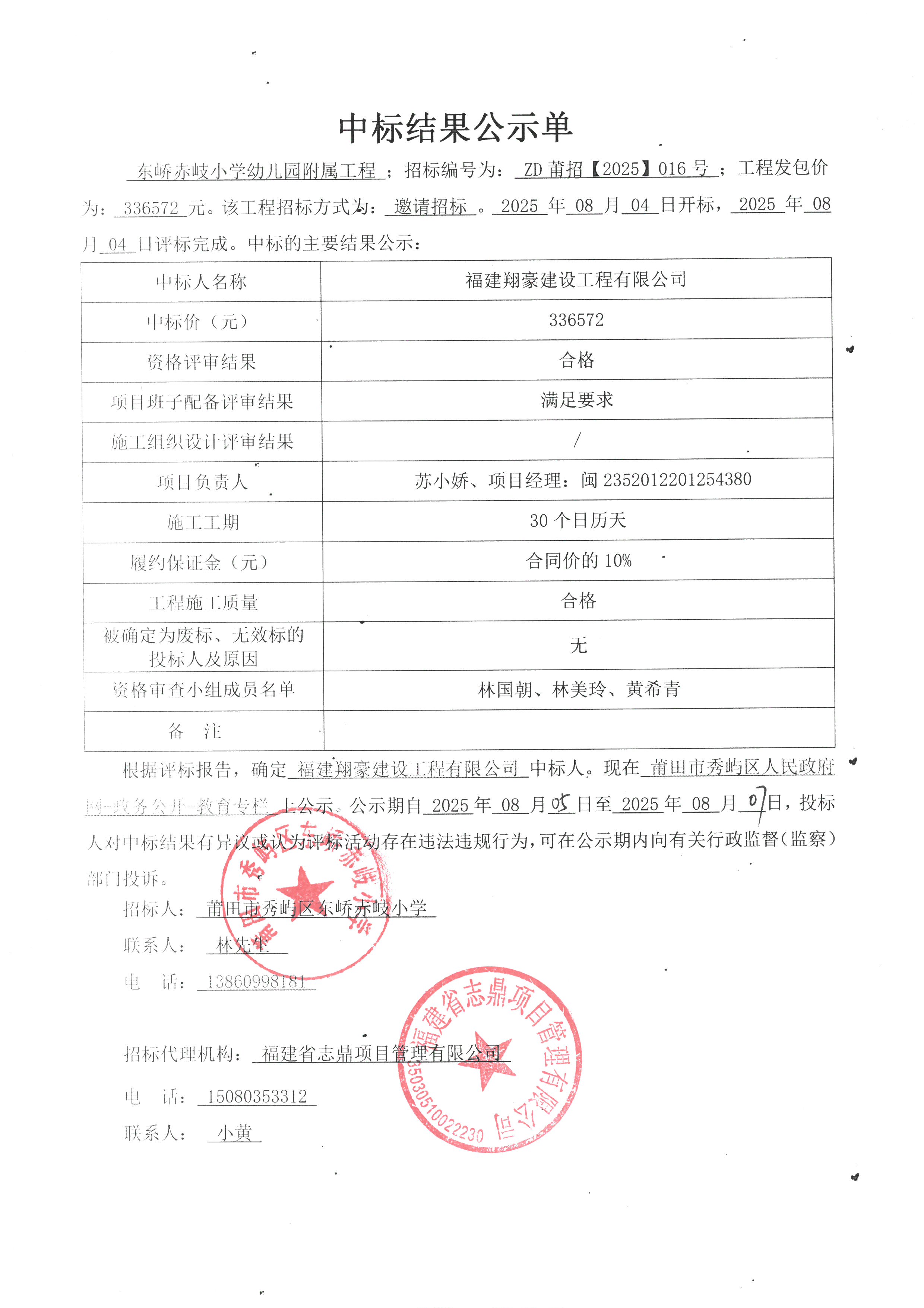 东峤赤岐小学幼儿园附属工程中标结果公示单