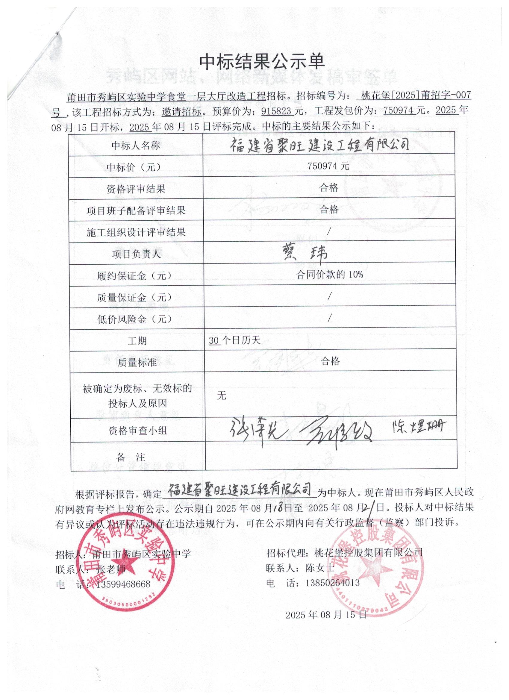 莆田市秀屿区实验中学食堂一层大厅改造工程中标结果公示单