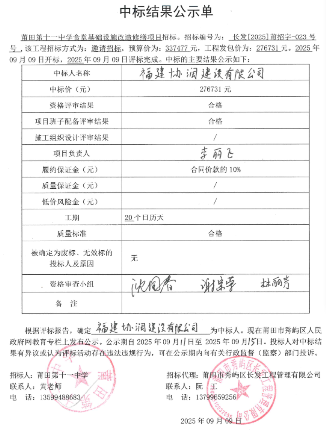 莆田第十一中学食堂基础设施改造修缮项目中标结果公示单