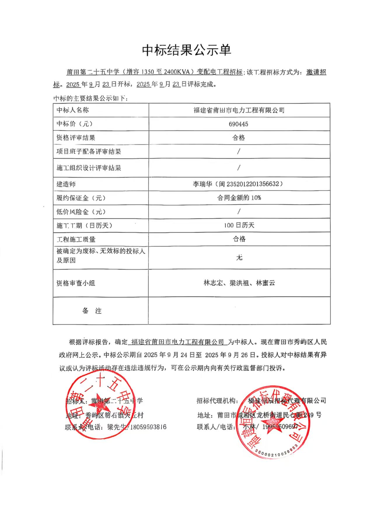 莆田第二十五中学(增容1350至2400KVA)变配电工程招标中标结果公示单
