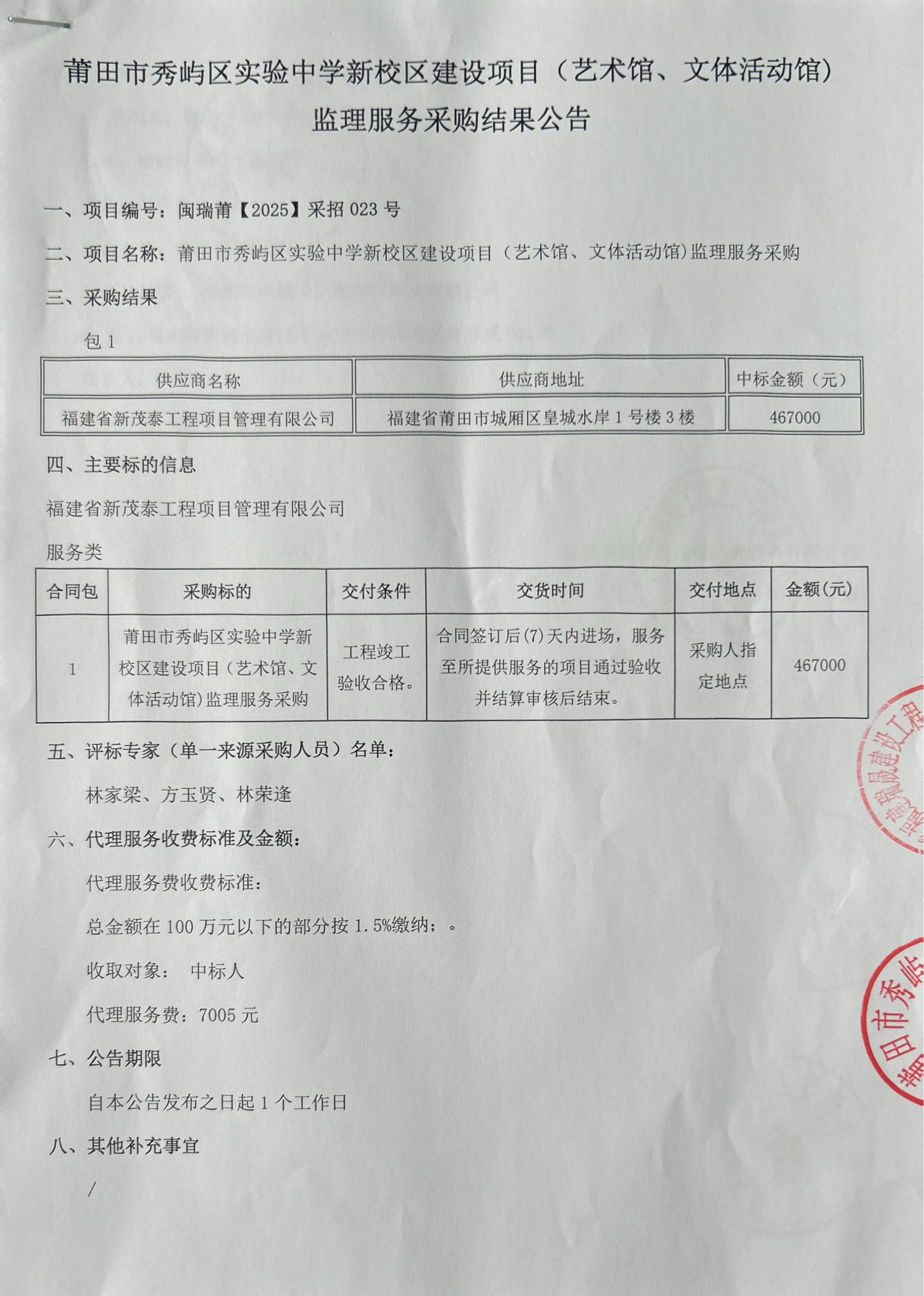 莆田市秀屿区实验中学新校区建设项目(艺术馆、文体活动馆)监理服务采购结果公告