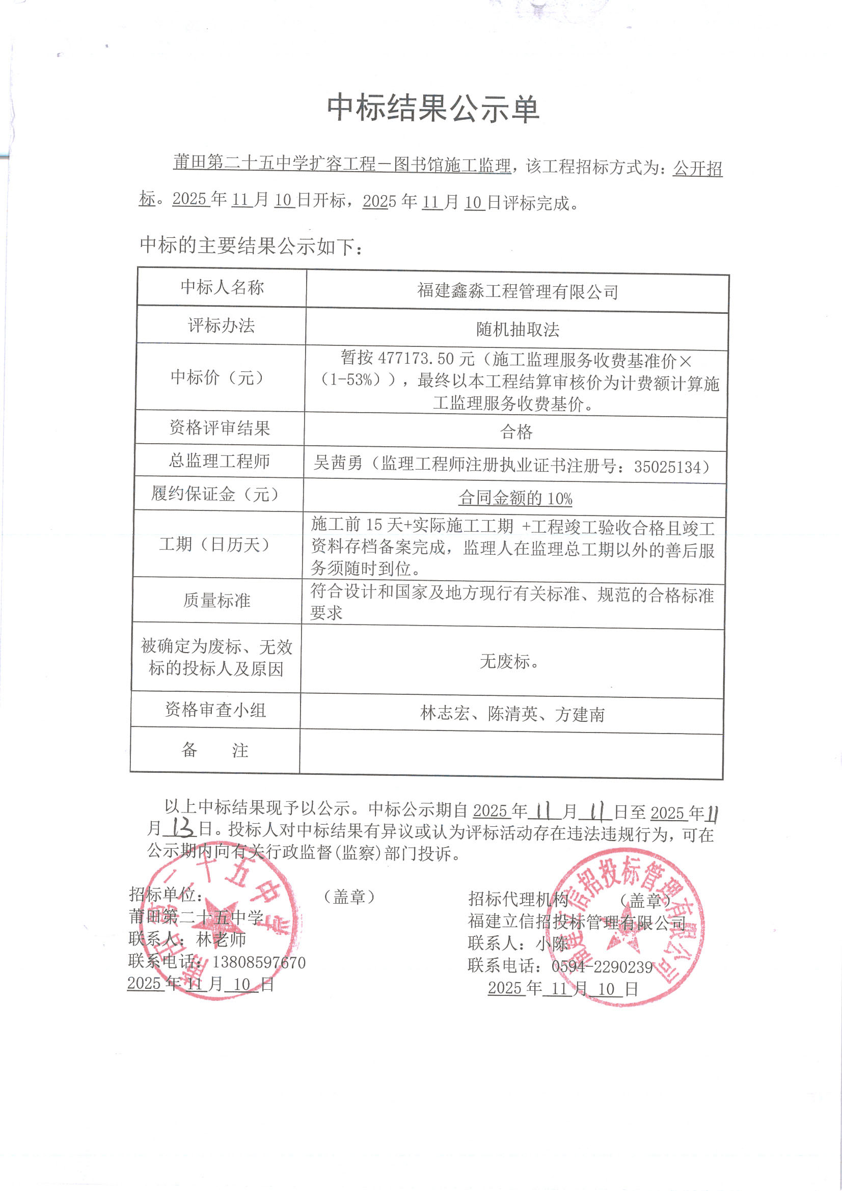莆田第二十五中学扩容工程——图书馆施工监理中标结果公示单