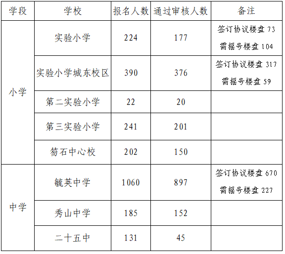 1.区第二实验小学、区第三实验小学、笏石中心校、秀山中学、二十五中因报名人数少于剩余学位数,通过材料审核的报名对象全部接收。