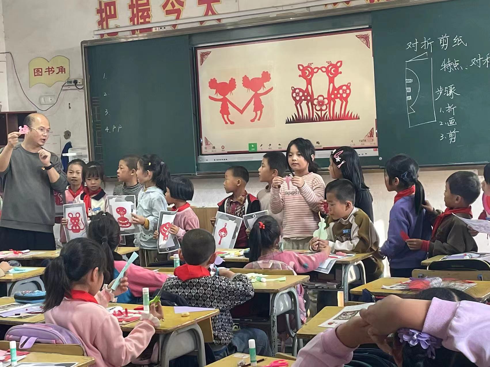 第一节课由区实验小学黄立程老师充分利用美术学科的特点,通过各种方式向学生展示中国传统文化---对折剪纸,潜移默化地渗透爱国思想教育,增进了学生对“折、画、剪”的理解。