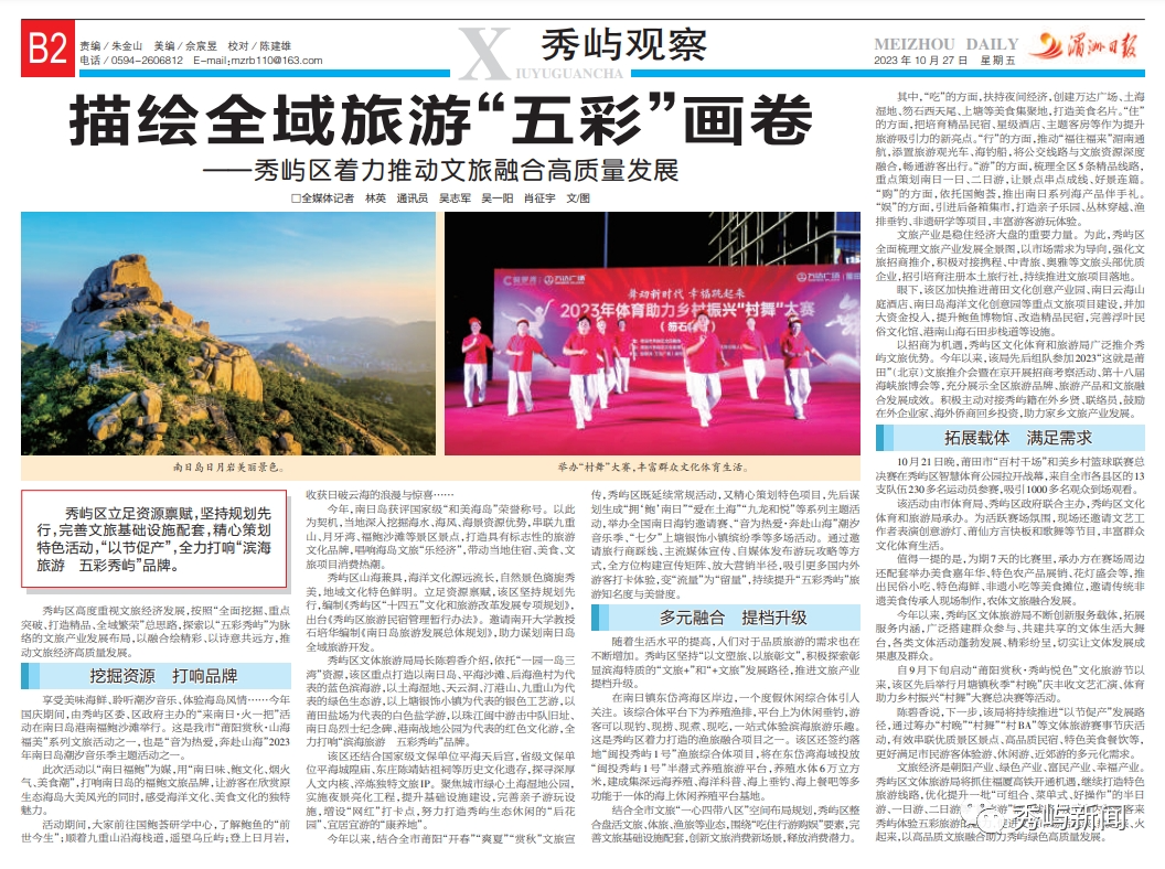 秀屿区高度重视文旅经济发展,按照“全面挖掘、重点突破、打造精品、全域繁荣”总思路,探索以“五彩秀屿”为脉络的文旅产业发展布局,以融合绘精彩、以诗意共远方,推动文旅经济高质量发展。