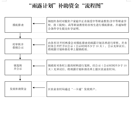 按照“镇村摸底排查、村审核并张榜公示、乡(镇)复核并公示、发放补助资金”的流程进行。