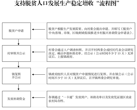 按照“脱贫户申请、村审核并公示、镇复核并公示、发放补助资金”的流程进行。