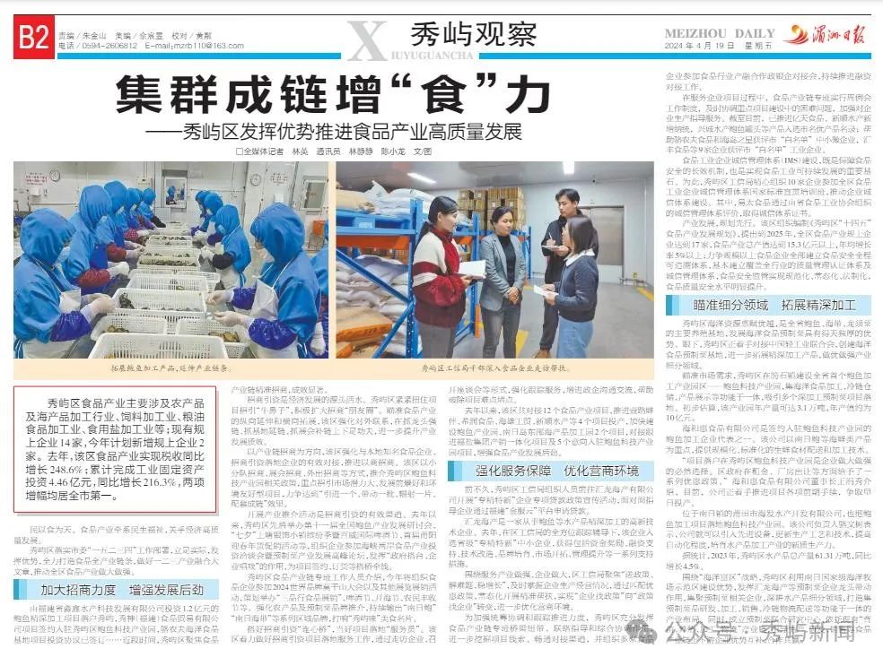秀屿区食品产业主要涉及农产品及海产品加工行业、饲料加工业、粮油食品加工业、食用盐加工业等;现有规上企业14家,今年计划新增规上企业2家。去年,秀屿区食品产业实现税收同比增长248.6%;累计完成工业固定资产投资4.46亿元,同比增长216.3%,两项增幅均居全市第一。 民以食为天。食品产业牵系民生福祉,关乎经济高质量发展。 秀屿区落实市委“一五二三四”工作部署,立足实际,发挥优势,全力打造食品全产业链条,做好一二三产业融合大文章,推动全区食品产业做大做强。 加大招商力度 增强发展后劲 由福建省淼鑫水产科技发展有限公司投资1.2亿元的鲍鱼精深加工项目落户秀屿,秀神(福建)食品贸易有限公司项目签约入驻秀屿区鲍鱼科技产业园,骆农夫海洋食品基地项目投资协议已签订……近段时间,秀屿区聚焦食品产业链精准招商,成效显著。