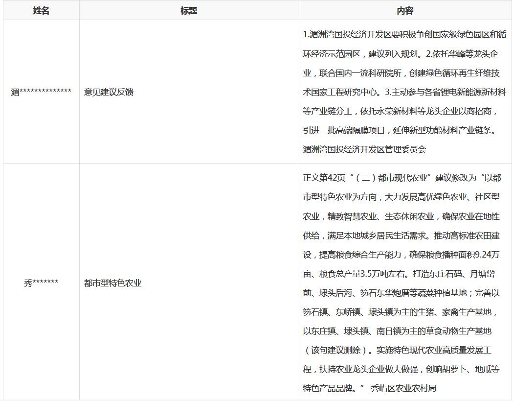 二是结合湄洲湾国投经开区管委会提出的“争创国家级绿色园区和循环经济示范园区”“依托华峰等龙头企业创建绿色循环再生纤维技术国家工程研究中心”“依托永荣新材料等龙头企业以商招商,引进一批高端隔膜项目”等反馈意见,分别对第四章第五章相关内容做了修改。