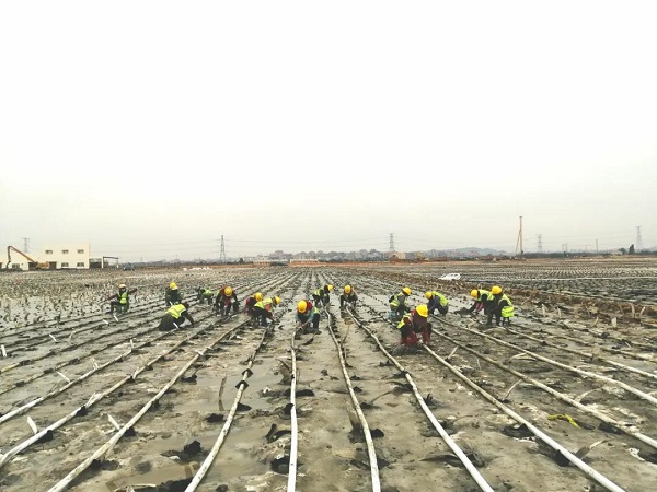 图为工人们正在软基处理