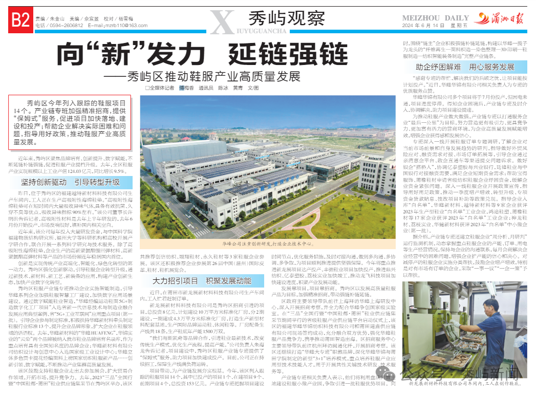 华峰公司注重创新研发,打造企业技术中心。 秀屿区鞋服产业链专班推动企业实施智能制造,引导华峰系列企业加强鞋服智慧工厂建设,加快数字应用场景建设。通过数字赋能鞋业智造,“华峰经编运动鞋面5G+制造数字化工厂项目”入选省新一代信息技术与制造业融合发展应用典型案例、省“5G+工业互联网”应用重点项目(第一批)。引导企业参与制定标准,积极扶持华峰新材料牵头制定鞋服行业标准13个,提升企业品牌形象,扩大企业在鞋服领域的话语权。去年,华峰新材料的“华峰HUAFENG”,华锦实业的“云染”两个品牌被纳入我市鞋业品牌培育名录库,作为重点培育具有全国知名度的品牌企业;华峰新材料有限公司纺织设计与创意中心入选国家级工业设计中心;华峰立体多色贾卡提花经编面料上榜国家纺织鞋服新产品……创新引领、数字赋能,不断推动产业集群高质量发展。 秀屿区鼓励支持鞋服企业走出去参加展会,扩大贸易合作领域,开拓市场,提升竞争力。去年,2023“三品”全国行暨“中国鞋都·莆田”鞋业供应链集采节在秀屿区举办,秀屿区共推荐创信纺织、翊翔鞋材、永久鞋材等3家鞋服企业参展。秀屿区还积极推荐企业参展第26届中国(温州)国际皮革、鞋材、鞋机展览会。 大力招引项目 积聚发展动能 近日,在莆田市新龙展新材料科技有限公司生产车间内,工人忙着赶制订单。