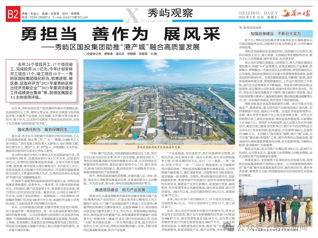去年24个项目开工、17个项目竣工,完成投资16.1亿元;今年计划安排开工项目17个、竣工项目10个……秀屿区国投集团强化担当,锐意进取,被区委、区政府评为“2023年度秀屿区突出经济贡献企业”“2023年度项目建设工作成绩突出集体”等,获得区属国企AA主体信用评级。 近年来,秀屿区国有资产投资集团有限公司围绕区委、区政府的中心工作,聚焦主责主业,坚持社会效益与经济效益并重,在服务产业发展、民生保障、乡村振兴等方面勇于担当、善于作为,以实际行动展现了国有企业的风采,实现了社会效益与经济效益“双丰收”。 强化责任担当 服务保障民生 连日来,在北京大学附属中学莆田学校项目现场,工人们加紧推进装修、绿化等工作。“‘五一’假期,近600名工人坚守岗位。”项目现场工程负责人王静表示,他们倒排工期,细化责任分工,增加“人、机、料”投入,合理调配,交叉作业,确保项目按序时完成交付并投入使用。 北大附中莆田学校位于莆田火车站高铁新城片区,项目用地约150亩,总建筑面积约14.4万平方米,总投资约10亿元,由秀屿区国投集团投资承建。计划5月底完成教学楼、宿舍楼、图书馆等大部分楼栋交付,9月前完工交付。该校将发挥北大附属中学的名校效应,开创莆田基础教育拔尖创新人才贯通培养模式先河,为秀屿区经济社会发展和“科教兴区”战略赋能添彩。 自2020年承接秀屿高铁新城项目建设以来,秀屿区国投集团勇挑重担,奋勇争先,一线攻坚,全力推进高铁新城征迁、学校建设、棚户区改造等工作,改善群众居住品质,助力老旧小区向宜居社区升级。截至目前,公司征迁100多万平方米,完成了北组团地块一、杨林地块二、丙店周转房、西徐棚改等棚户区改造100多万平方米,承建的市实验小学秀屿分校、工业职业技术学校相继交付投用。 去年,公司积极盘活资源,对峻兴管桩企业进行收购,用于新建市第一医院新院区,进一步完善高铁新城及秀屿城区的服务功能。公司还积极参与到高铁片区北组团市政道路、平海疏港路续建工程、平海疏港溪边连接线、欣业路、上林路、青美南路以及建筑垃圾消纳处理等市政工程项目,特别是完成涵港大道提升改造工程示范段并顺利通车,进一步提升城区形象。 “学校、棚户区改造、市政道路建设都是民生工程,我们全力以赴为民办好实事,补齐了民生短板,彰显国企担当。”秀屿区国投集团副总经理肖银敏告诉记者,公司持续优化调整国资布局结构,紧扣区委区政府中心工作,提升竞争力、影响力和抗风险能力,推动国有资产全面服务于民生、基础设施建设和产业发展等。