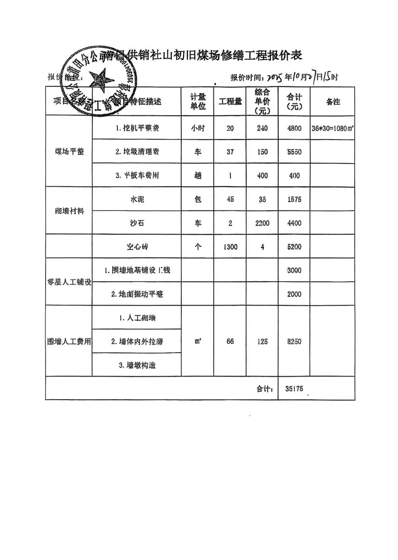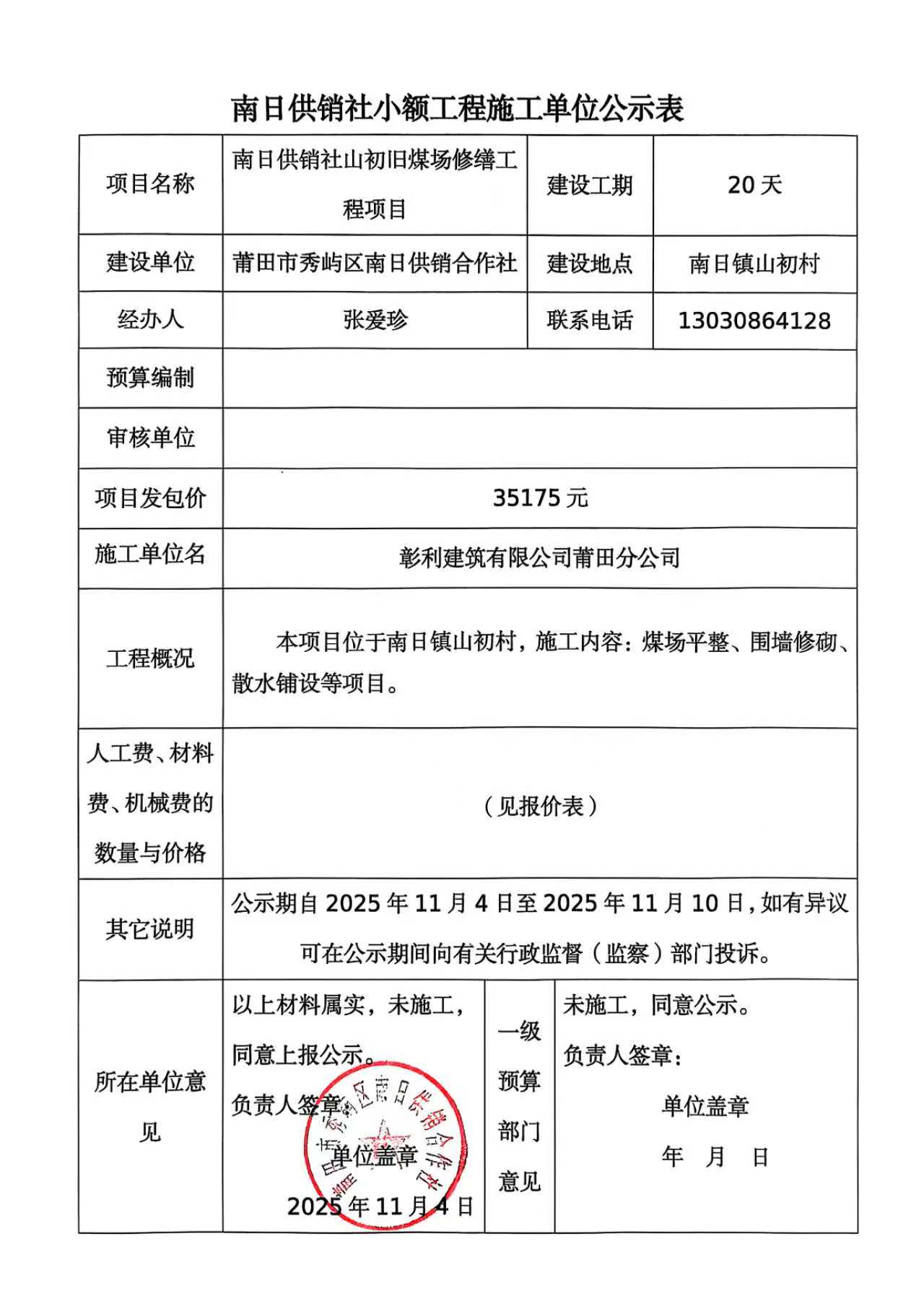 秀屿区南日供销社小额工程施工单位公示表