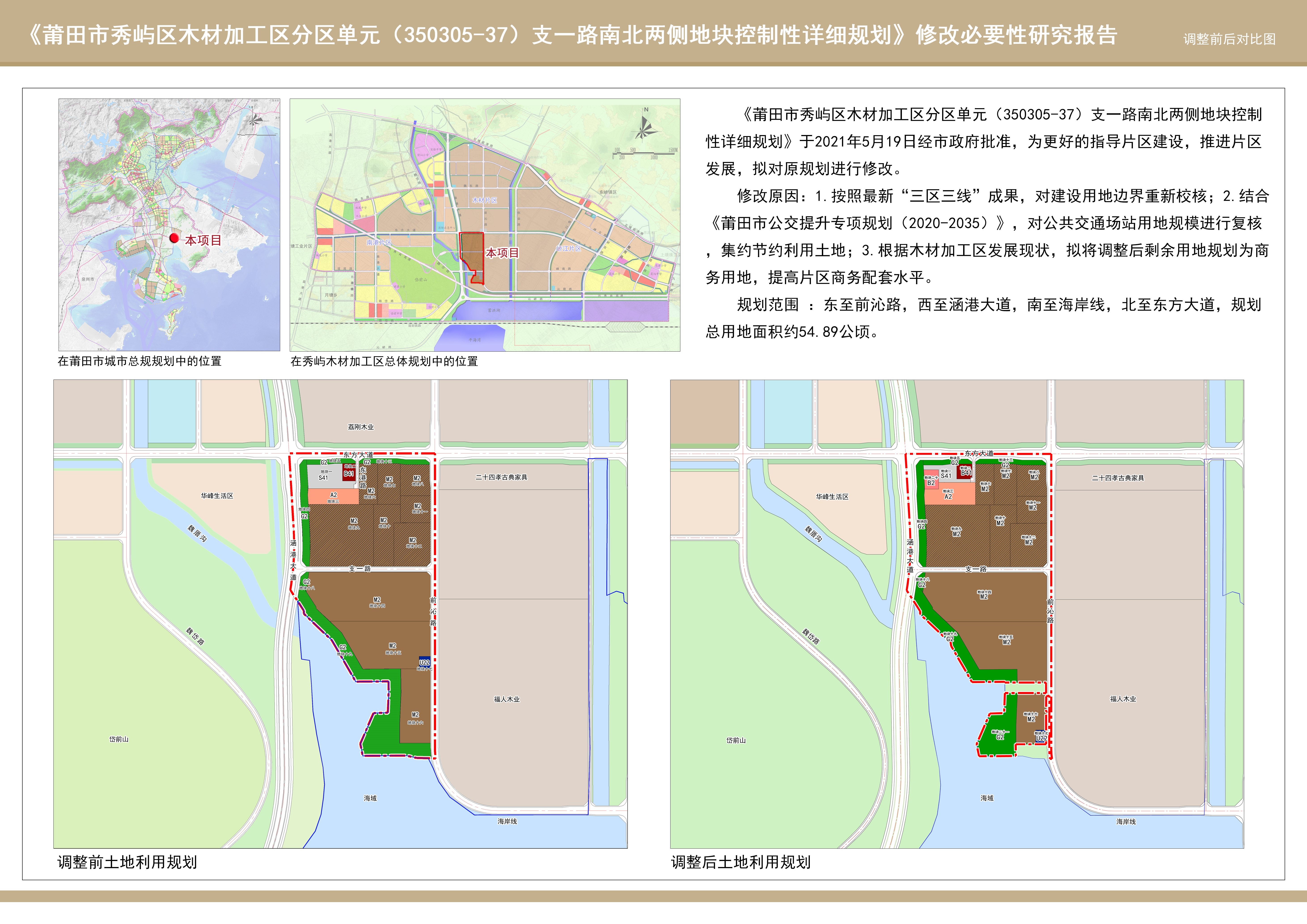 《莆田市秀屿区木材加工区分区单元(350305-37)支一路南北两侧地块控制性详细规划》于2021年5月19日经市政府批准,为更好地指导片区建设,推进片区发展,拟对原规划进行修改。修改原因:1.按照最新“三区三线”成果,对建设用地边界重新校核;2.结合《莆田市公交提升专项规划(2020-2035)》,对公共交通场站用地规模进行复核,集约节约利用土地;3.根据木材加工区发展现状,拟将调整后剩余用地规划为商务用地,提高片区商务配套水平。规划范围 :东至前沁路,西至涵港大道,南至海岸线,北至东方大道,规划总用地面积约54.89公顷。