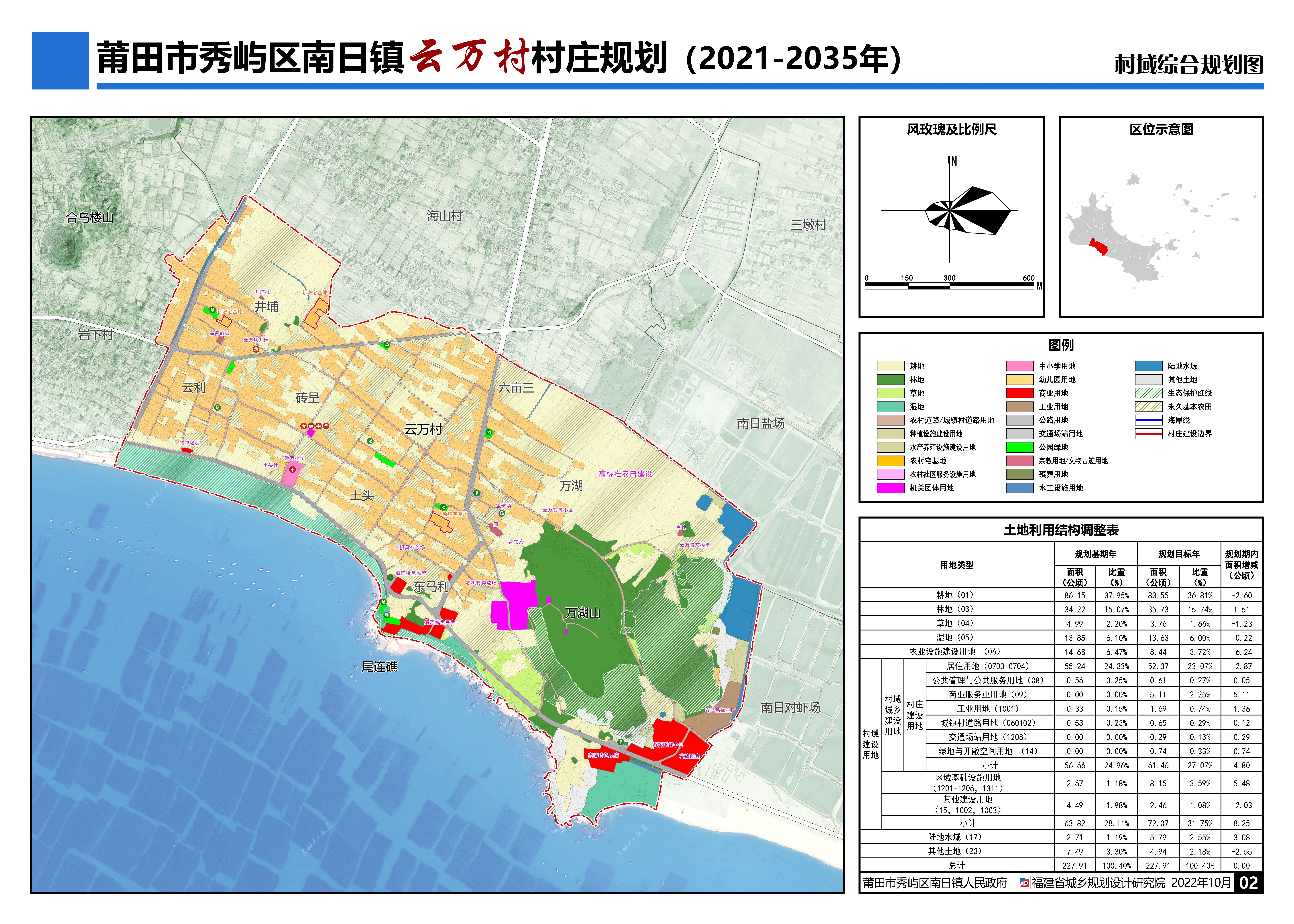 《秀屿区南日镇云万村村庄规划(2021-2035)》由福建工程学院与福建省城乡规划设计研究院编制,规划方案经各部门意见征询、专家评审和公示后,2023年5月15日经莆田市秀屿区人民政府批复(莆秀政〔2023〕61号)。根据《中华人民共和国城乡规划法》、《福建省村庄规划编制指南(试行)》等相关法律法规要求,现将规划成果予以公布。