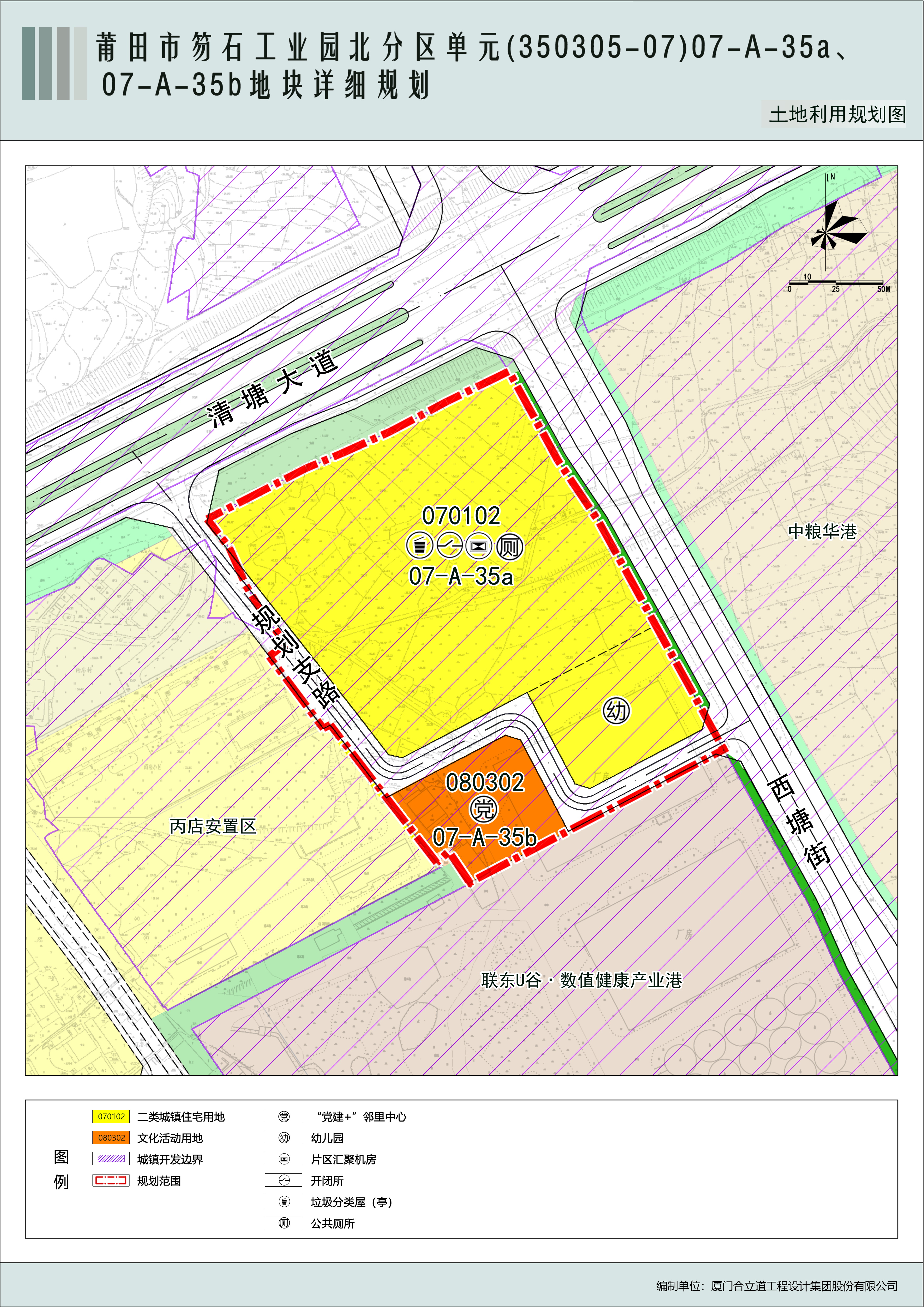 莆田市笏石工业园北分区单元(350305-07)A-35a、A-35b地块规划四至范围:东至西塘街防护绿地、西至丙店小区、南至一类工业用地、北至清塘大道防护绿地,规划总用地面积约4.1公顷。