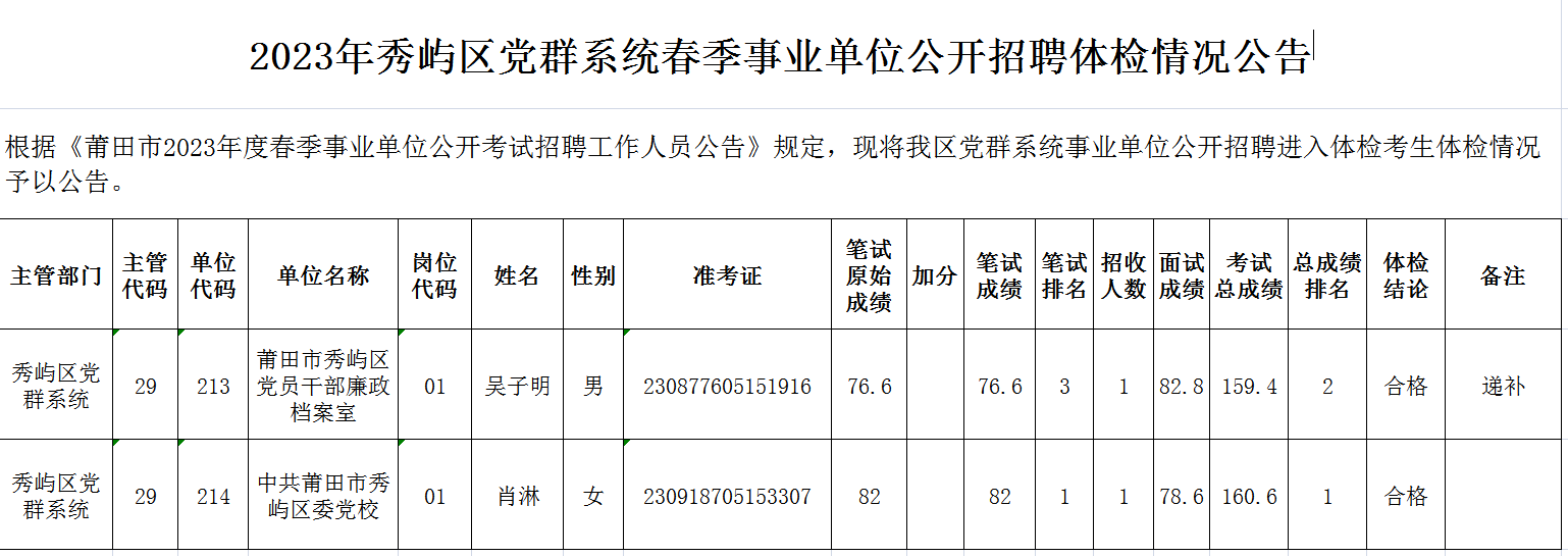2023年秀屿区党群系统春季事业单位公开招聘体检情况公告