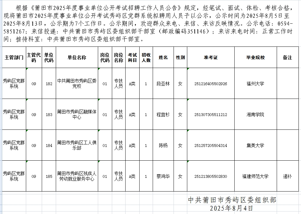 莆田市2025年度事业单位公开考试秀屿区党群系统拟聘用人员公示