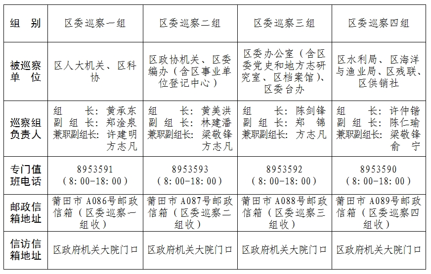 根据党中央关于巡视巡察决策部署及省委、市委、区委工作要求,经区委巡察工作领导小组研究决定,从8月中旬开始,区委巡察组对区委办公室(含区委党史和地方志研究室、区档案馆)、区人大机关、区政协机关、区委编办(含区事业单位登记中心)、区委台办、区科协等单位党组织开展常规巡察,并对区水利局、区海洋与渔业局、区残联、区供销社等单位党组织开展巡察“回头看”工作,常规巡察时间40天左右,巡察“回头看”时间50天左右。日前,巡察组已进驻巡察。