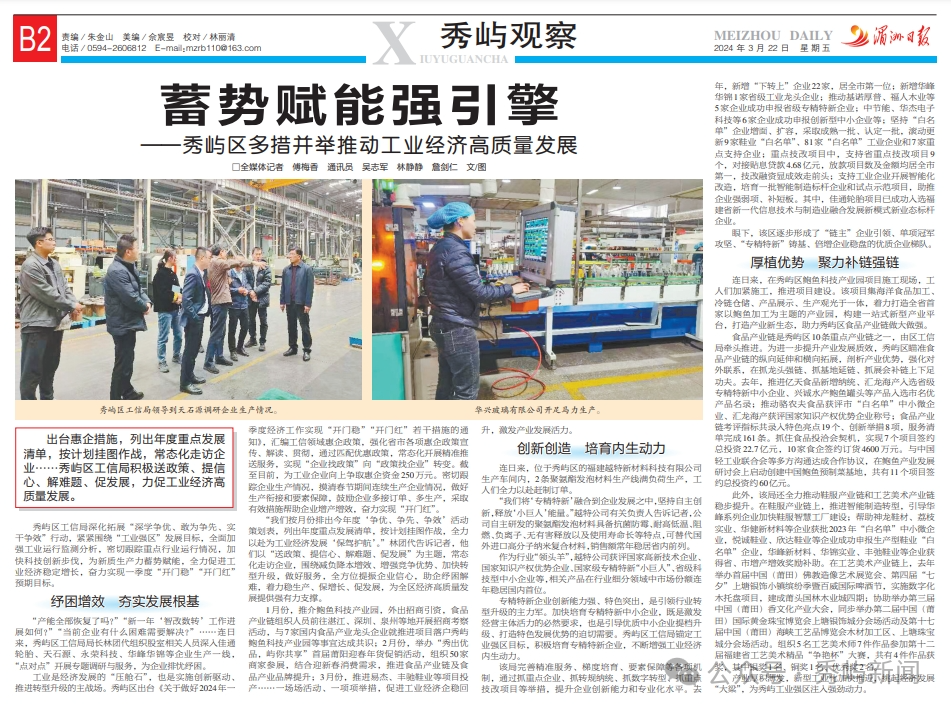 秀屿区工信局领导到天石源调研企业生产情况。 工业是经济发展的“压舱石”,也是实施创新驱动、推进转型升级的主战场。秀屿区出台《关于做好2024年一季度经济工作实现“开门稳”“开门红”若干措施的通知》,汇编工信领域惠企政策,强化省市各项惠企政策宣传、解读、贯彻,通过匹配优惠政策,常态化开展精准推送服务,实现“企业找政策”向“政策找企业”转变。截至目前,为工业企业向上争取惠企资金250万元。密切跟踪企业生产情况,摸清春节期间连续生产企业情况,做好生产衔接和要素保障,鼓励企业多接订单、多生产,采取有效措施帮助企业增产增效,奋力实现“开门红”。 “我们按月份排出今年度‘争优、争先、争效’活动策划表,列出年度重点发展清单,按计划挂图作战,全力以赴为工业经济发展‘保驾护航’。”林团代告诉记者,他们以“送政策、提信心、解难题、促发展”为主题,常态化走访企业,围绕减负降本增效、增强竞争优势、加快转型升级,做好服务,全方位提振企业信心,助企纾困解难,着力稳生产、保增长、促发展,为全区经济高质量发展提供强有力支撑。 1月份,推介鲍鱼科技产业园,外出招商引资,食品产业链组织人员前往湛江、深圳、泉州等地开展招商考察活动,与7家国内食品产业龙头企业就推进项目落户秀屿鲍鱼科技产业园等事宜达成共识;2月份,举办“秀出优品,屿你共享”首届莆阳迎春年货促销活动,组织50家商家参展,结合迎新春消费需求,推进食品产业链及食品产业品牌提升;3月份,推进易杰、丰驰鞋业等项目投产……一场场活动、一项项举措,促进工业经济企稳回升,激发产业发展活力。 创新创造 培育内生动力 连日来,位于秀屿区的福建越特新材料科技有限公司生产车间内,2条聚氨酯发泡材料生产线满负荷生产,工人们全力以赴赶制订单。 “我们将‘专精特新’融合到企业发展之中,坚持自主创新,释放‘小巨人’能量。”越特公司有关负责人告诉记者,公司自主研发的聚氨酯发泡材料具备抗菌防霉、耐高低温、阻燃、负离子、无有害释放以及使用寿命长等特点,可替代国外进口高分子纳米复合材料,销售额常年稳居省内前列。 作为行业“领头羊”,越特公司获评国家高新技术企业、国家知识产权优势企业、国家级专精特新“小巨人”、省级科技型中小企业等,相关产品在行业细分领域中市场份额连年稳居国内首位。 专精特新企业创新能力强、特色突出,是引领行业转型升级的主力军。加快培育专精特新中小企业,既是激发经营主体活力的必然要求,也是引导优质中小企业提档升级、打造特色发展优势的迫切需要。秀屿区工信局锚定工业强区目标,积极培育专精特新企业,不断增强工业经济内生动力。 该局完善精准服务、梯度培育、要素保障等各项机制,通过抓重点企业、抓转规纳统、抓数字转型、抓重点技改项目等举措,提升企业创新能力和专业化水平。去年,新增“下转上”企业22家,居全市第一位;新增华峰华锦1家省级工业龙头企业;推动基诺厚普、福人木业等5家企业成功申报省级专精特新企业;中节能、华杰电子科技等6家企业成功申报创新型中小企业等;坚持“白名单”企业增面、扩容,采取成熟一批、认定一批,滚动更新9家鞋业“白名单”、81家“白名单”工业企业和7家重点支持企业;重点技改项目中,支持省重点技改项目9个,对接贴息贷款4.68亿元,放款项目数及金额均居全市第一,技改融资显成效走前头;支持工业企业开展智能化改造,培育一批智能制造标杆企业和试点示范项目,助推企业强弱项、补短板。其中,佳通轮胎项目已成功入选福建省新一代信息技术与制造业融合发展新模式新业态标杆企业。 眼下,秀屿区逐步形成了“链主”企业引领、单项冠军攻坚、“专精特新”铸基、倍增企业稳盘的优质企业梯队。 厚植优势 聚力补链强链 连日来,在秀屿区鲍鱼科技产业园项目施工现场,工人们加紧施工,推进项目建设。该项目集海洋食品加工、冷链仓储、产品展示、生产观光于一体,着力打造全省首家以鲍鱼加工为主题的产业园,构建一站式新型产业平台,打造产业新生态,助力秀屿区食品产业链做大做强。 食品产业链是秀屿区10条重点产业链之一,由区工信局牵头推进。为进一步提升产业发展质效,秀屿区瞄准食品产业链的纵向延伸和横向拓展,剖析产业优势,强化对外联系,在抓龙头强链、抓基地延链、抓展会补链上下足功夫。去年,推进亿天食品新增纳统、汇龙海产入选省级专精特新中小企业、兴诚水产鲍鱼罐头等产品入选市名优产品名录;推动骆农夫食品获评市“白名单”中小微企业、汇龙海产获评国家知识产权优势企业称号;食品产业链考评指标共录入特色亮点19个、创新举措8项,服务清单完成161条。抓住食品投洽会契机,实现7个项目签约总投资22.7亿元,10家食企签约订货4600万元。与中国轻工业联合会等多方沟通达成合作协议,在鲍鱼产业发展研讨会上启动创建中国鲍鱼预制菜基地,共有11个项目签约总投资约60亿元。 此外,该局还全力推动鞋服产业链和工艺美术产业链稳步提升。在鞋服产业链上,推进智能制造转型,引导华峰系列企业加快鞋服智慧工厂建设;帮助神龙鞋材、荔枝实业、华健新材料等企业获批2023年“白名单”中小微企业,悦诚鞋业、欣达鞋业等企业成功申报生产型鞋业“白名