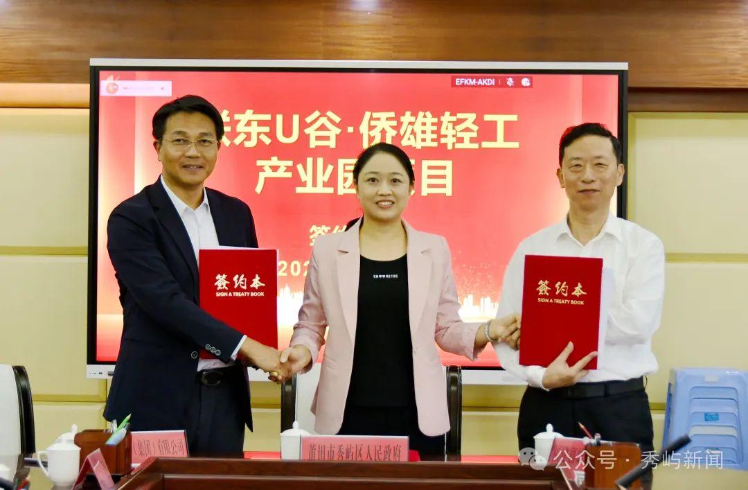 11月8日,联东U谷·侨雄轻工产业园项目成功签约落地,为秀屿产业升级发展注入了新活力,也为区域存量产业用地盘活提供了有益示范。这是近期秀屿区深化“空间换地”模式,加速推进低效产业用地盘活处置,促进产业空间“腾笼换鸟”的一个重要试点。湄洲湾国投经济开发区管委会主任郑燕平,北京联东投资(集团)有限公司助理总裁陈冰,福建嘉雄玩具有限公司总经理柯天宗等出席。