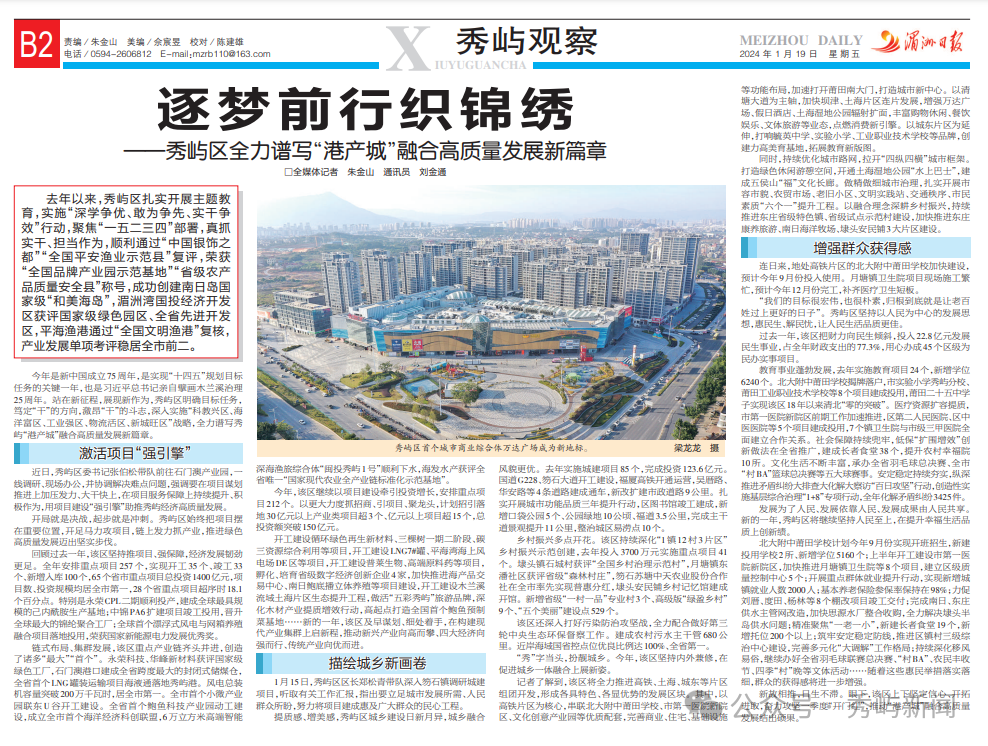 全球首个漂浮式风渔融合项目在南日岛海上风电场完成安装,即将投产使用。 链式布局、集群发展,秀屿区重点产业链齐头并进,创造了诸多“最大”“首个”。永荣科技、华峰新材料获评国家级绿色工厂,石门澳港口建成全省跨度最大的封闭式储煤仓,全省首个LNG罐装运输项目海液通落地秀屿港。风电总装机容量突破200万千瓦时,居全市第一。全市首个小微产业园联东U谷开工建设。全省首个鲍鱼科技产业园动工建设,成立全市首个海洋经济科创联盟,6万立方米高端智能深海渔旅综合体“闽投秀屿1号”顺利下水,海发水产获评全省唯一“国家现代农业全产业链标准化示范基地”。 今年,秀屿区继续以项目建设牵引投资增长,安排重点项目212个。以更大力度抓招商、引项目、聚龙头,计划招引落地30亿元以上产业类项目超3个、亿元以上项目超15个,总投资额突破150亿元。 开工建设循环绿色再生新材料、三棵树一期二阶段、碳三资源综合利用等项目,开工建设LNG7#罐、平海湾海上风电场DE区等项目,开工建设普莱生物、高端原料药等项目,孵化、培育省级数字经济创新企业4家,加快推进海产品交易中心、南日鲍底播立体养殖等项目建设,开工建设木兰溪流域土海片区生态提升工程,做活“五彩秀屿”旅游品牌,深化木材产业提质增效行动,高起点打造全国首个鲍鱼预制菜基地……新的一年,秀屿区及早谋划、细处着手,在构建现代产业集群上启新程,推动新兴产业向高而攀、四大经济向强而行、传统产业向优而进。 描绘城乡新画卷 1月15日,秀屿区区长郑松青带队深入笏石镇调研城建项目,听取有关工作汇报,指出要立足城市发展所需、人民群众所盼,努力将项目建成惠及广大群众的民心工程。