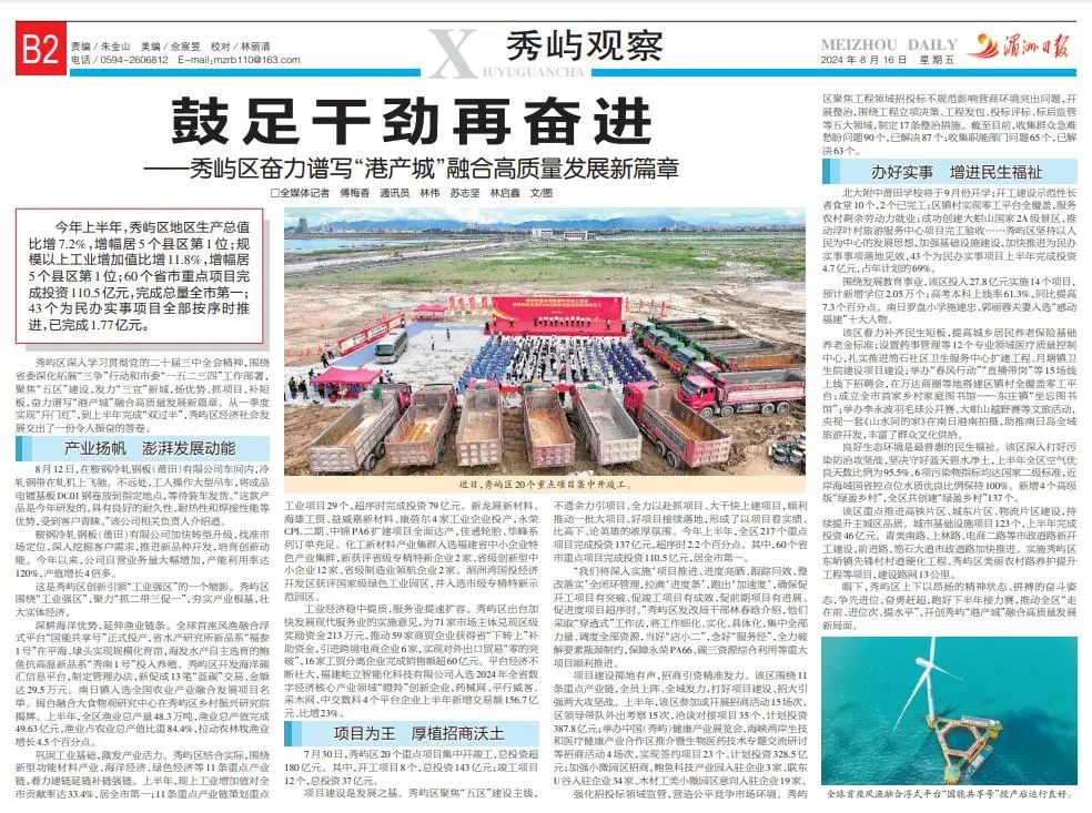 秀屿区深入学习贯彻党的二十届三中全会精神,围绕省委深化拓展“三争”行动和市委“一五二三四”工作部署,聚焦“五区”建设,发力“三宜”新城,扬优势、抓项目、补短板,奋力谱写“港产城”融合高质量发展新篇章。从一季度实现“开门红”,到上半年完成“双过半”,秀屿区经济社会发展交出了一份令人振奋的答卷。