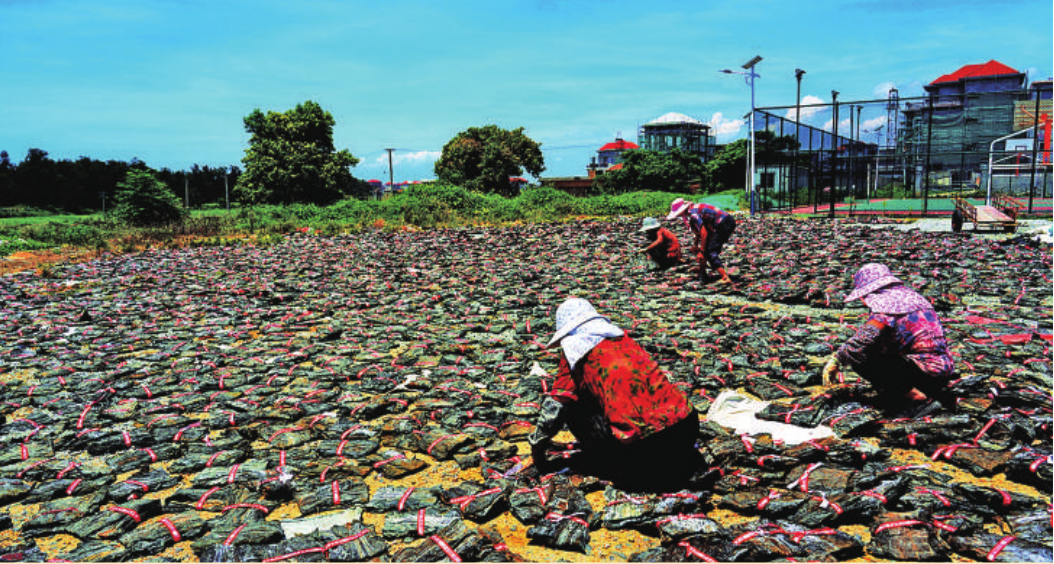 养殖户组织工人对晒干的海带进行包装。 除了建设农副产品加工基地,村里还有多个“变废为宝”的成功案例。修缮一新的旧医疗站,如今已成为秀屿区首个标准化农机服务中心。该中心创新采用“村购企租”模式,集中采购6台大型轮式拖拉机租赁给农业企业,每年为村集体创收约12万元。闲置的原溪西小学和原海星小学旧址,经过修缮后租赁给养殖户进行海带、龙须菜包装,既带动村民就业,又为村集体年增收2万元。
