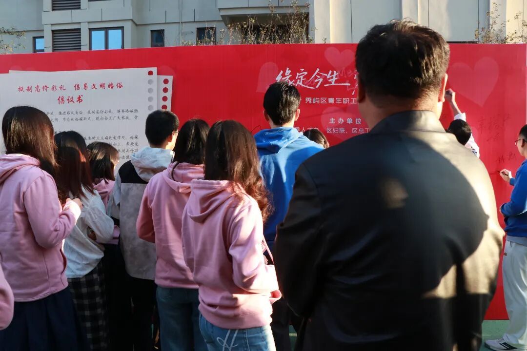 活动深度融合移风易俗宣传,情景剧《婆媳互夸》、小品《乡里乡亲》等节目生动演绎文明家风,倡导简约适度、真诚纯粹的婚恋理念。区妇联向青年们致以问候,鼓励大家在秀屿收获爱情、扎根成长。随后,与会领导与青年们共同在移风易俗签名墙上签字,集体倡议“抵制高价彩礼、崇尚文明婚恋”,以实际行动培树良好家风,弘扬新时代婚育新风。