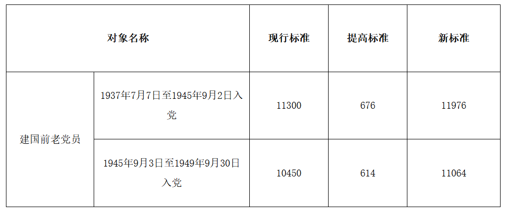 六、提高建国前加入中国共产党的农村老党员和未享受离退休待遇的城镇老党员的生活补贴标准,调整后的补贴标准为:
