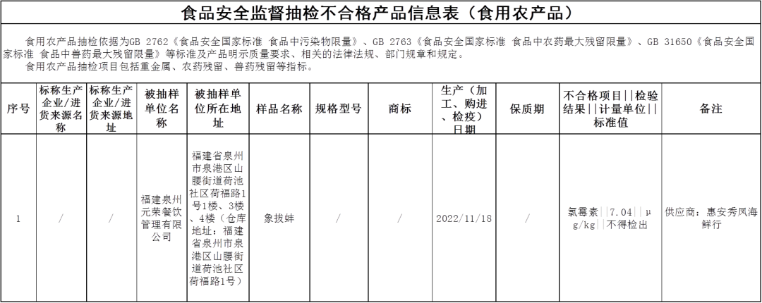 福建泉州元荣餐饮管理有限公司销售的象拔蚌(购进日期为2022年11月18日),氯霉素不符合食品安全国家标准规定。福建泉州元荣餐饮管理有限公司对检验结果提出异议,并申请复检;经复检后,维持初检结论。