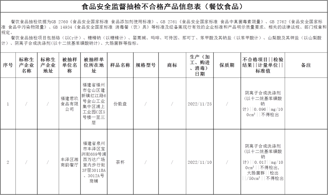 丰泽区湘南韵餐厅的茶杯(消毒日期为2022年11月10日),阴离子合成洗涤剂(以十二烷基苯磺酸钠计)、大肠菌群不符合食品安全国家标准规定。
