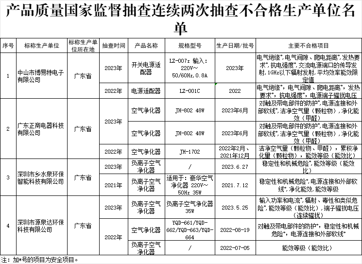 (八)空气净化器。在京东、天猫、拼多多等15家平台54家销售单位抽查56批次产品,涉及广东、江苏、上海等12个省份50家生产单位,抽查发现24批次产品不合格。其中,有5批次产品对触及带电部件的防护不合格,4批次产品输入功率和电流不合格,6批次产品稳定性和机械危险不合格,3批次产品结构不合格,8批次产品电源连接和外部软线不合格,1批次产品辐射、毒性和类似危险不合格,均为安全项目;8批次产品洁净空气量不合格,8批次产品能效等级不合格。