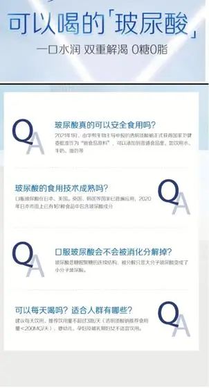 上海市消保委通过查询发现,在玻尿酸获批入食时相关企业曾向媒体公开表示从2004年开始申报,已经走过了16年,“过程虽然漫长,但结果很甜蜜”,“透明质酸作为新食品的原料,消费者可通过日常饮食的摄入补充透明质酸,有效提高人体内的玻尿酸含量,进而减少或改善因玻尿酸减少所带来的皱纹、关节等一系列问题。”